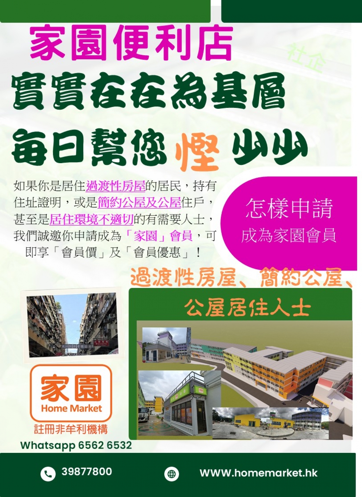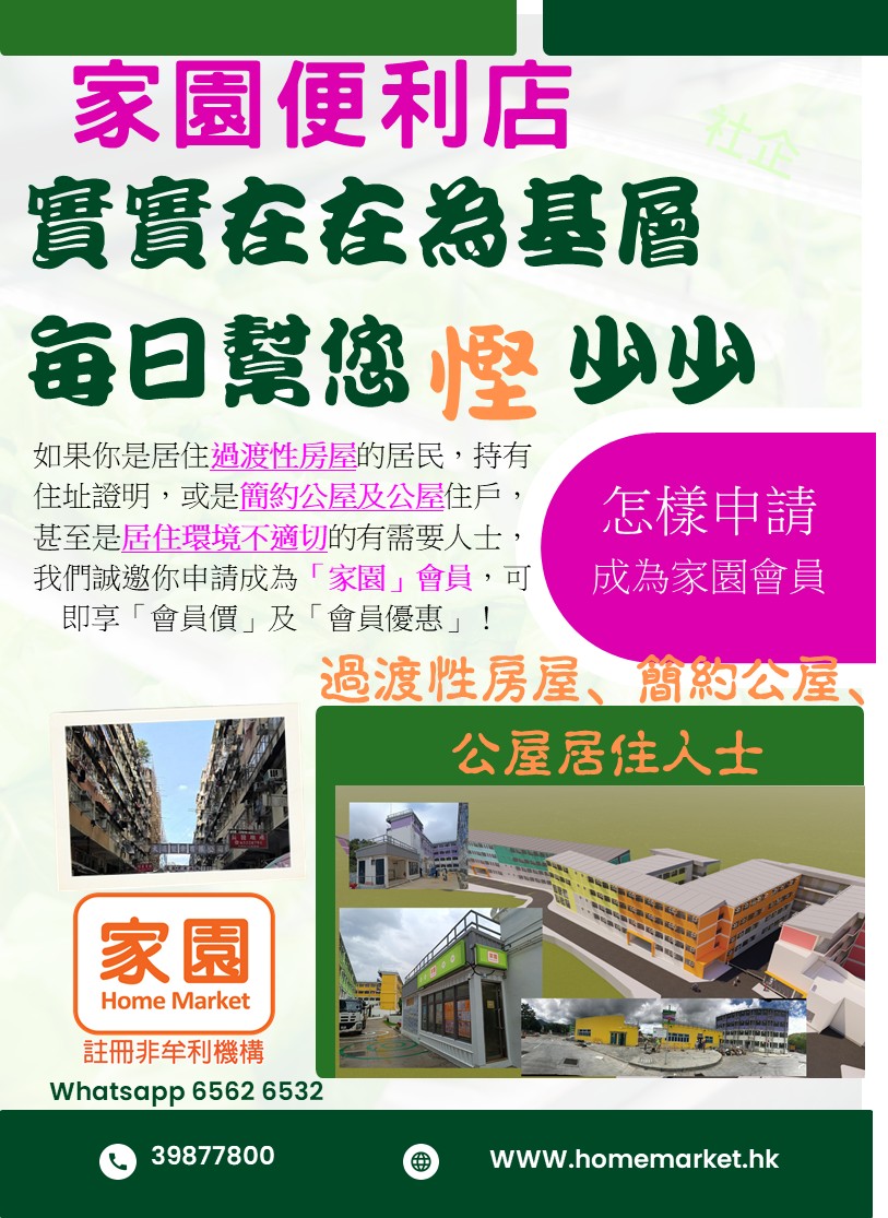 如果你是居住過渡性房屋的居民,持有住址證明,或是簡約公屋及公屋住戶,甚至是居住環境不適切的有需要人士,我們誠邀你申請成為「家園」會員,可即享會員價及會員優惠!快來加入我們,一起創造更美好的社區!