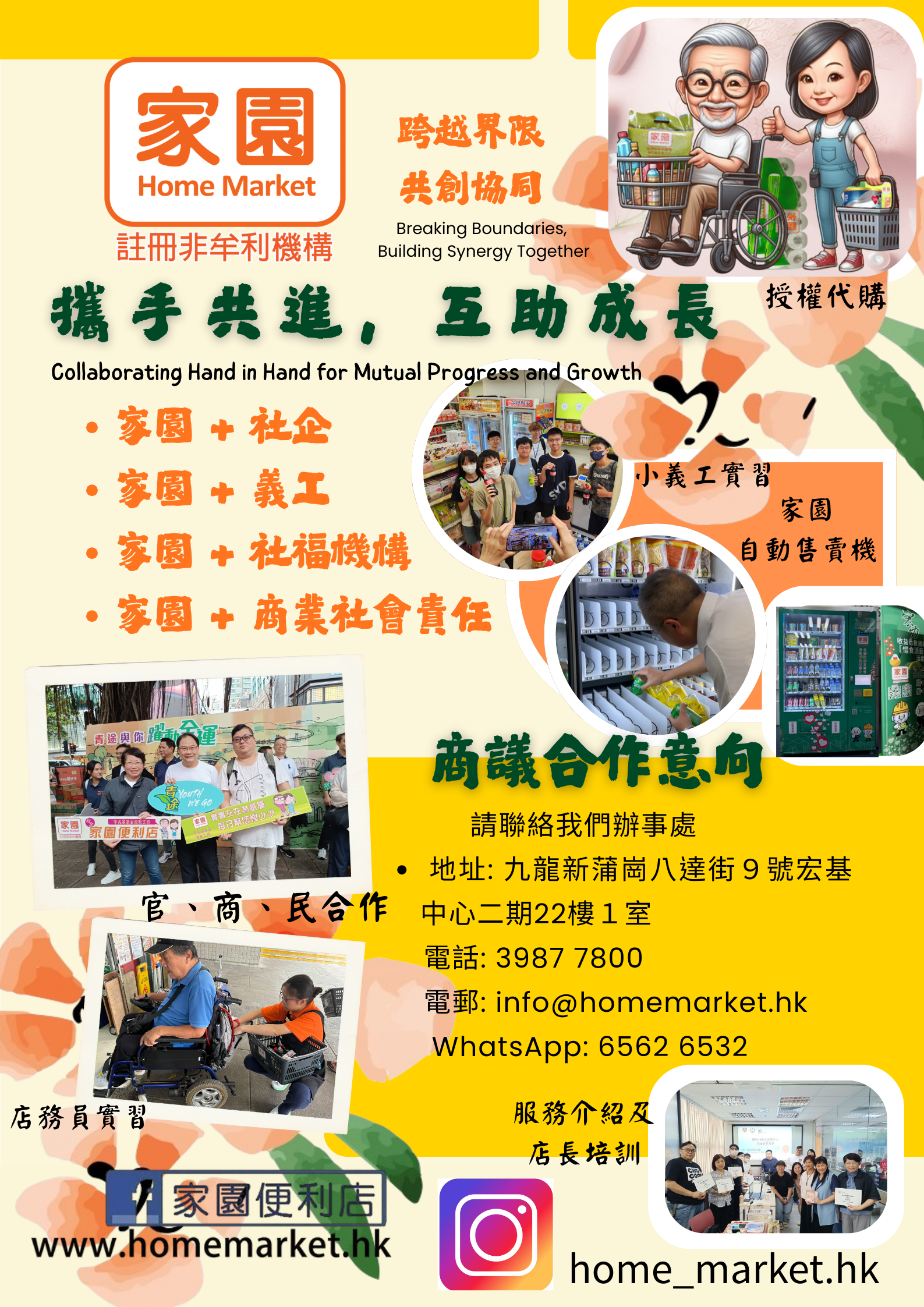 同時,我們積極與社會福利機構及商業社會責任團隊合作,舉辦多元活動,包括店務員及小義工實習、自動售賣機運作,以及官、商、民的共創協同與互助成長。
