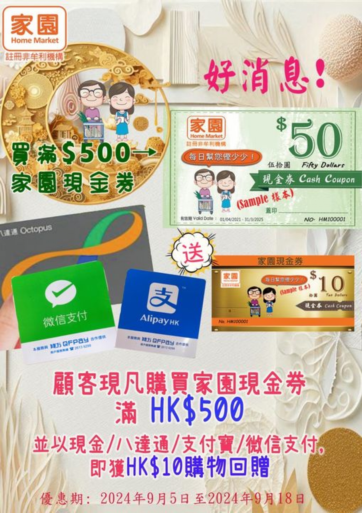 優惠內容: 只需在家園17間分店門市購買$500的家園現金券,即可獲得$10的現金券回贈!並可即時享用。