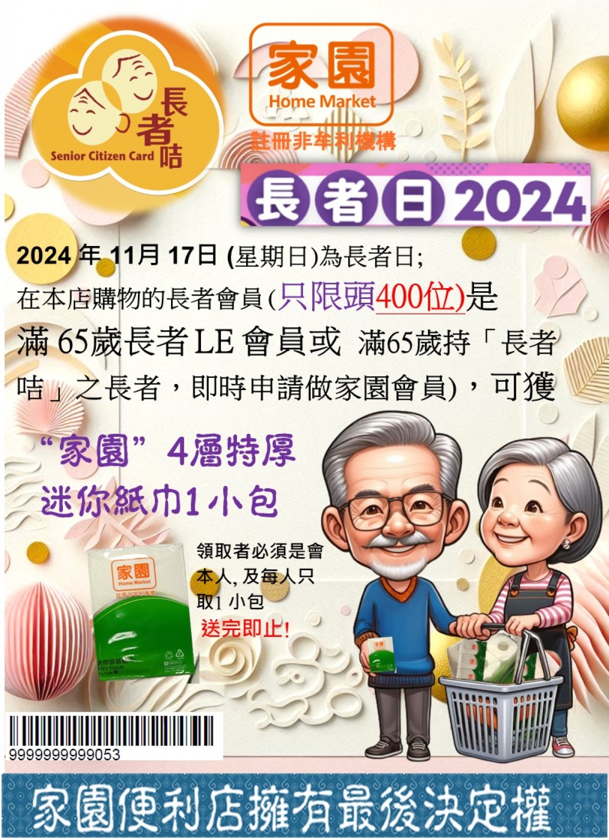 2024年「長者日」定於11月17日(星期日)。在這一天,老友記除了可以免費乘搭港鐵、輕鐵及港鐵巴士等交通工具外,還可於11月16日(星期六)在家園便利店(港鐵南昌店及雙魚薈店)及在11月17日長者日當天,享受會員價購物,亦可獲得家園迷你紙巾一小包作為小小心意。