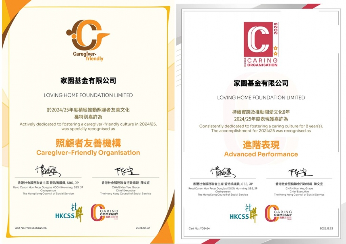 這次嘉許「家園」在建立關懷文化和支持員工方面的重要貢獻。特別在彈性工作安排及多項支援措施,因而榮獲「照顧者友善」特別嘉許。