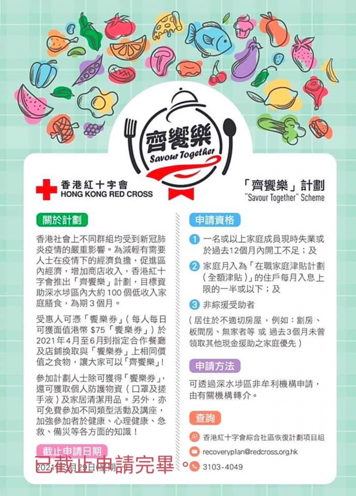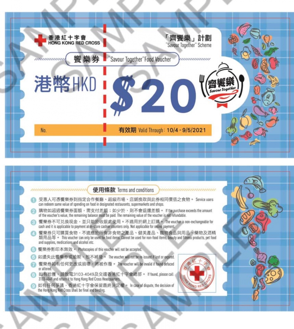 Let's enjoy it, let it go! The COVID-19 has affected the lives of citizens, and even seriously affected daily livelihoods and employment, especially for the lower grassroots in Hong Kong. The "Hong Kong Red Cross" teamed up with the Sham Shui Po Branch of Home Market and together with more than 30 restaurants and supermarkets to launch the "Savour Together" plan, and give out $5 and $20 "Food Coupons" for the people in need. The goal is to subsidize about 100 low-income families in Sham Shui Po district for food and beverages and support the income of small businesses in Sham Shui Po at the same time. Event Date: April 10, 2021, to July 9, 2021 (3 months) Stores used: Sham Shui Po Branch Shop address: 222 Keelung Street, Sham Shui Po Only for food or beverages in the store with the value of the voucher, not non-food items. For details, please contact the staff or call the "Hong Kong Red Cross" 3103-4049.