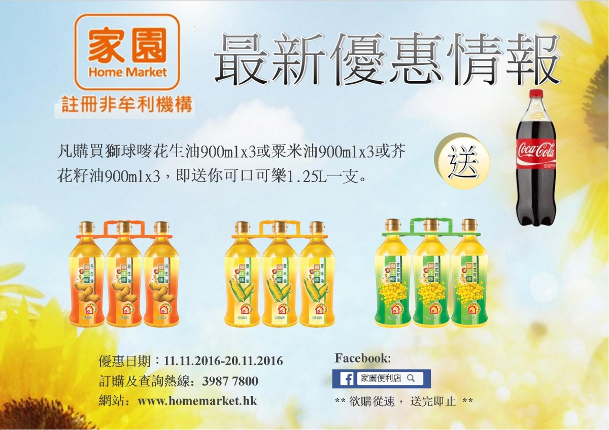 由11.11.2016起至20.11.2016期間,凡購買獅球嘜花生油900mlx3或粟米油900mlx3或芥花籽油900mlx3,即送你可口可樂1.25L一支,欲購從速, 送完即止!