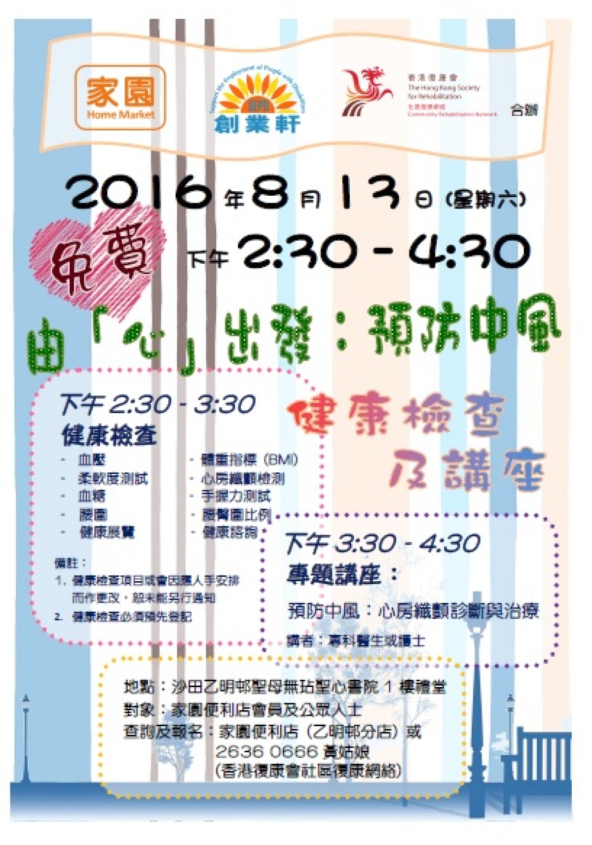 家園便利店將於8月13日(星期六)於沙田乙明邨舉辦健康檢查及講座。主題為:由「心」出發:預防中風。誠意邀約乙明邨店長者會員參與,「由心出發」,共同關注健康。
