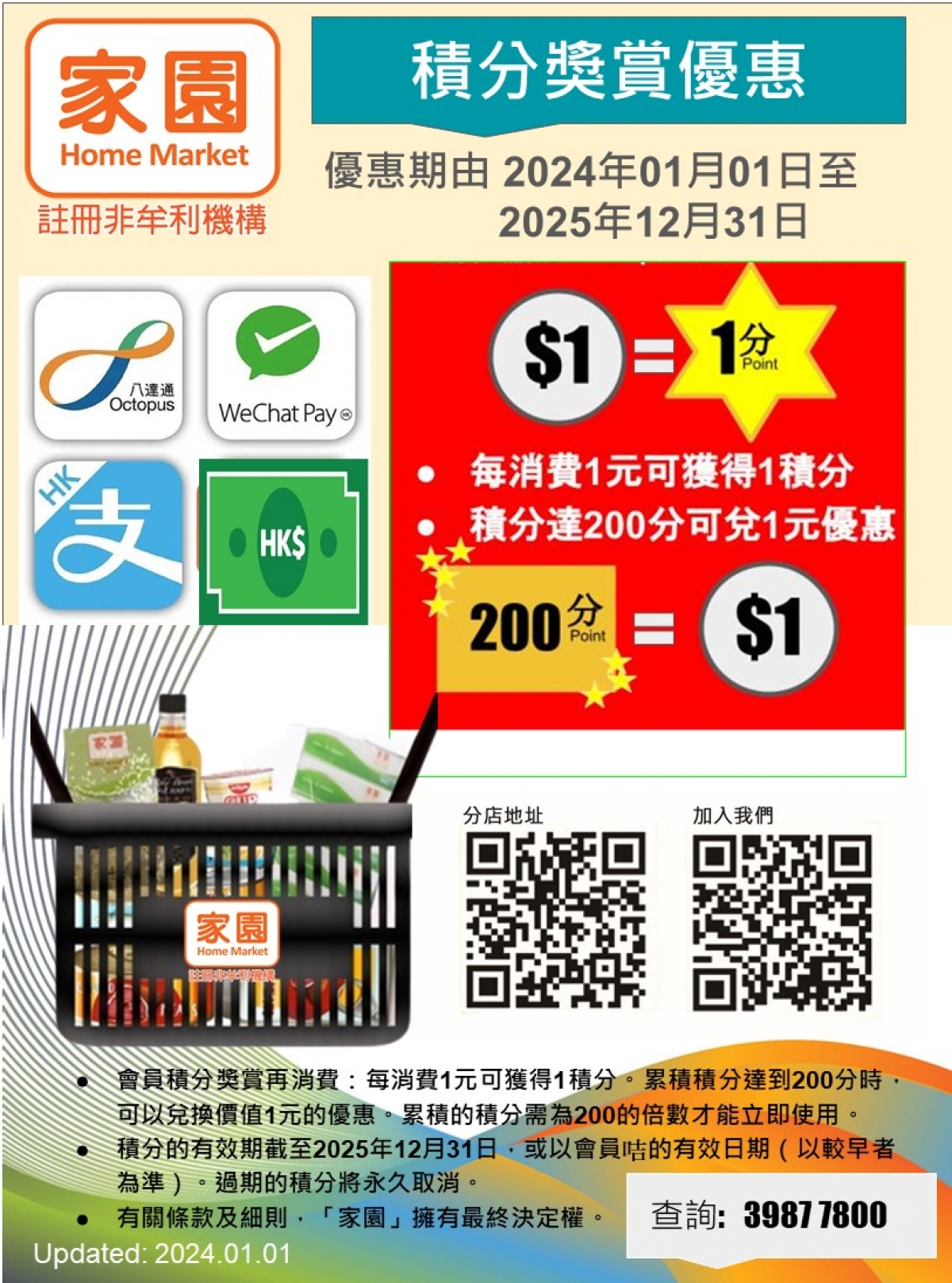 Happy New Year 2024-2025年會員積分獎賞再消費:每消費1元可獲得1積分。累積積分達到200分時,可以兌換價值1元的優惠。累積的積分需為200的倍數才能立即使用。積分的有效期截至2025年12月31日,或以會員咭的有效日期(以較早者為準) 祝大家新年快樂