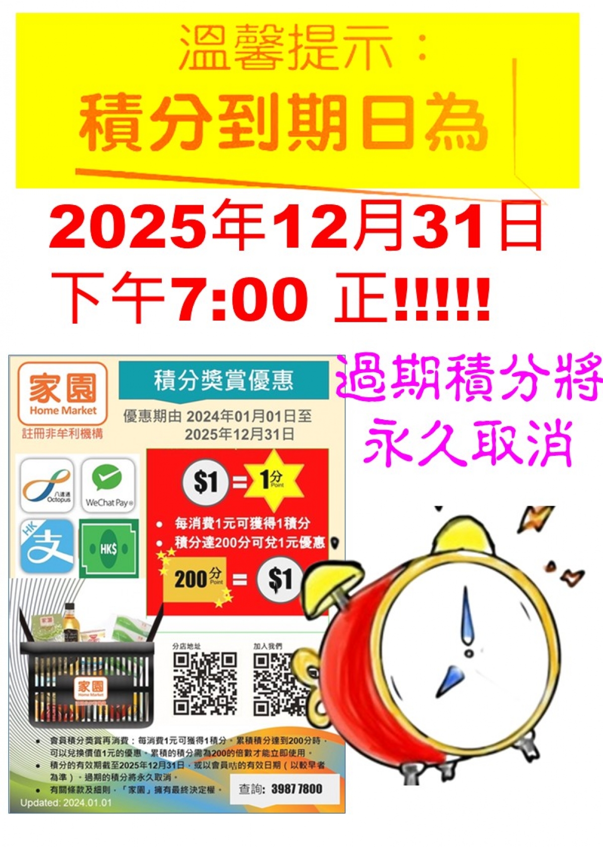 溫馨提示: 2024-2025年會員積分獎賞再消費:每消費1元可獲得1積分。累積積分達到200分時,可以兌換價值1元的優惠。累積的積分需為200的倍數才能立即使用。積分的有效期截至2025年12月31日晚上7:00正。 過期積分將永久失效。