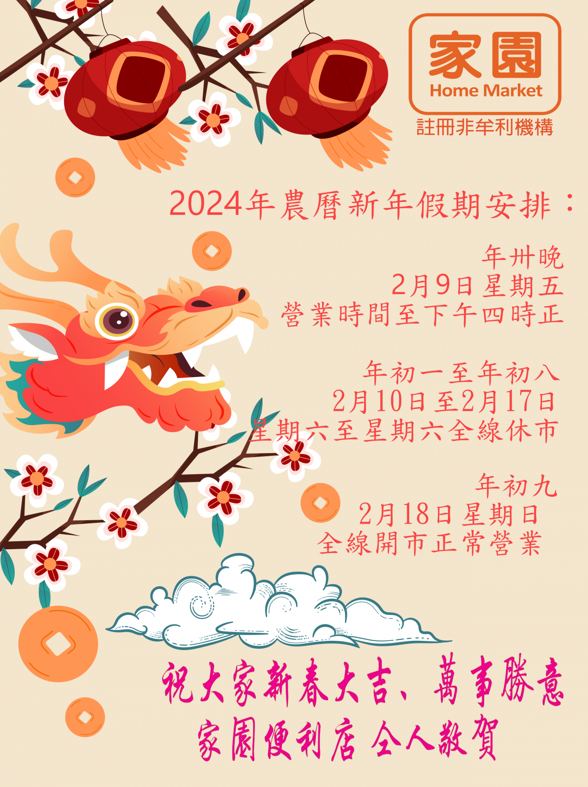 「家園便利店」農曆新年假期安排: