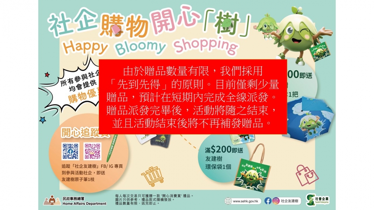如果您仍對「社企友建樹購物獎賞紀念品」有興趣及希望繼續支持本地社企,歡迎大家前往其他有意義的社企繼續您的「開心樹」購物體驗。